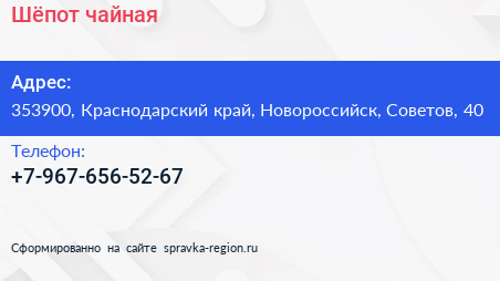 Шёпот, чайная по адресу 353900, Краснодарский край, Новороссийск, Советов, 40 в дальнейшем Организация, размещена в следующих категориях: