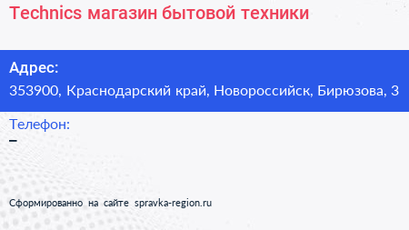Technics, магазин бытовой техники по адресу 353900, Краснодарский край, Новороссийск, Бирюзова, 3 в дальнейшем Организация, размещена в следующих категориях: