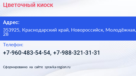 Цветочный киоск по адресу 353925, Краснодарский край, Новороссийск, Молодёжная, 28 в дальнейшем Организация, размещена в следующих категориях: