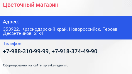 Цветочный магазин по адресу 353922, Краснодарский край, Новороссийск, Героев Десантников, 2 к4 в дальнейшем Организация, размещена в следующих категориях: