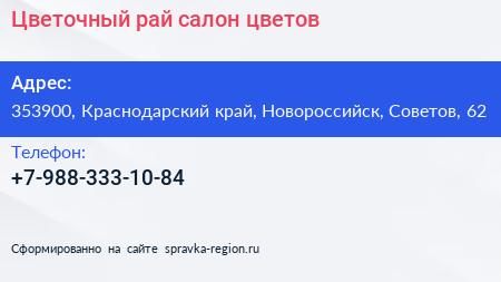 Цветочный рай, салон цветов по адресу 353900, Краснодарский край, Новороссийск, Советов, 62 в дальнейшем Организация, размещена в следующих категориях: