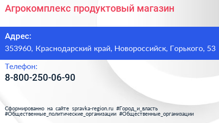 Агрокомплекс, продуктовый магазин по адресу 353960, Краснодарский край, Новороссийск, Горького, 53 в дальнейшем Организация, размещена в следующих категориях: