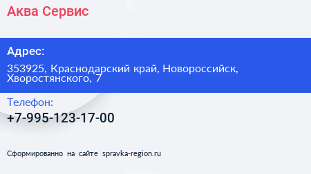 Аква Сервис по адресу 353925, Краснодарский край, Новороссийск, Хворостянского, 7 в дальнейшем Организация, размещена в следующих категориях: