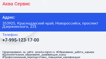 Аква Сервис по адресу 353925, Краснодарский край, Новороссийск, проспект Дзержинского, 231 в дальнейшем Организация, размещена в следующих категориях: