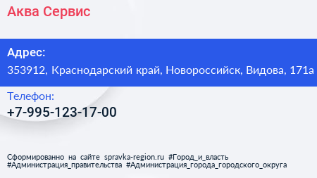 Аква Сервис по адресу 353912, Краснодарский край, Новороссийск, Видова, 171а в дальнейшем Организация, размещена в следующих категориях: