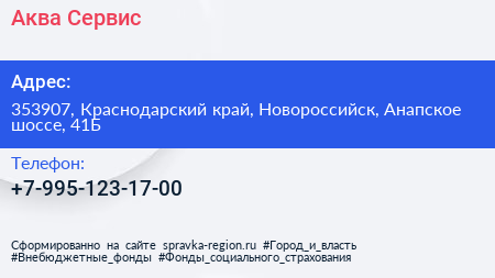 Аква Сервис по адресу 353907, Краснодарский край, Новороссийск, Анапское шоссе, 41Б в дальнейшем Организация, размещена в следующих категориях:
