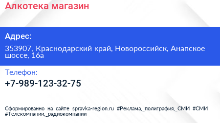 Алкотека, магазин по адресу 353907, Краснодарский край, Новороссийск, Анапское шоссе, 16а в дальнейшем Организация, размещена в следующих категориях: