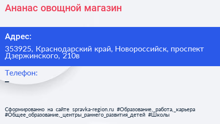 Ананас, овощной магазин по адресу 353925, Краснодарский край, Новороссийск, проспект Дзержинского, 210в в дальнейшем Организация, размещена в следующих категориях: