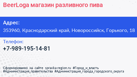 BeerLoga, магазин разливного пива по адресу 353960, Краснодарский край, Новороссийск, Горького, 18 в дальнейшем Организация, размещена в следующих категориях: