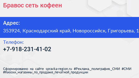 Бравос, сеть кофеен по адресу 353924, Краснодарский край, Новороссийск, Григорьева, 1 в дальнейшем Организация, размещена в следующих категориях: