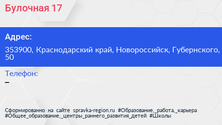 Булочная №17 по адресу 353900, Краснодарский край, Новороссийск, Губернского, 50 в дальнейшем Организация, размещена в следующих категориях: