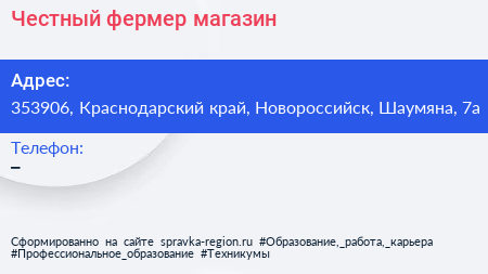 Честный фермер, магазин по адресу 353906, Краснодарский край, Новороссийск, Шаумяна, 7а в дальнейшем Организация, размещена в следующих категориях:
