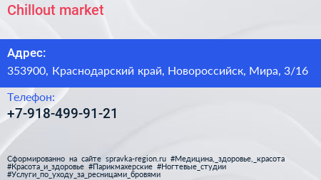 Chillout market по адресу 353900, Краснодарский край, Новороссийск, Мира, 3/16 в дальнейшем Организация, размещена в следующих категориях: