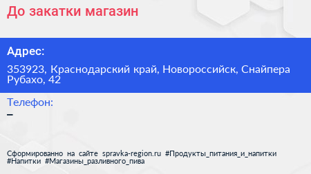 До закатки, магазин по адресу 353923, Краснодарский край, Новороссийск, Снайпера Рубахо, 42 в дальнейшем Организация, размещена в следующих категориях: