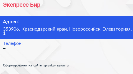 Экспресс-Бир по адресу 353906, Краснодарский край, Новороссийск, Элеваторная, 1 в дальнейшем Организация, размещена в следующих категориях: