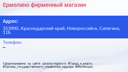 Ермолино, фирменный магазин по адресу 353900, Краснодарский край, Новороссийск, Сипягина, 11Б в дальнейшем Организация, размещена в следующих категориях: