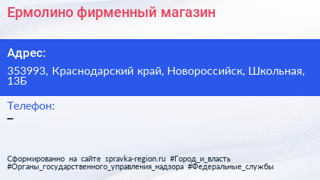 Ермолино, фирменный магазин по адресу 353993, Краснодарский край, Новороссийск, Школьная, 13Б в дальнейшем Организация, размещена в следующих категориях: