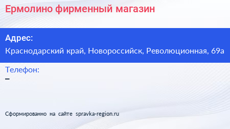 Ермолино, фирменный магазин по адресу Краснодарский край, Новороссийск, Революционная, 69а в дальнейшем Организация, размещена в следующих категориях: