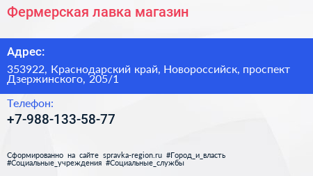 Фермерская лавка, магазин по адресу 353922, Краснодарский край, Новороссийск, проспект Дзержинского, 205/1 в дальнейшем Организация, размещена в следующих категориях: