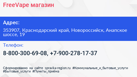 FreeVape, магазин по адресу 353907, Краснодарский край, Новороссийск, Анапское шоссе, 19 в дальнейшем Организация, размещена в следующих категориях: