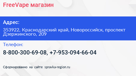 FreeVape, магазин по адресу 353922, Краснодарский край, Новороссийск, проспект Дзержинского, 209 в дальнейшем Организация, размещена в следующих категориях:
