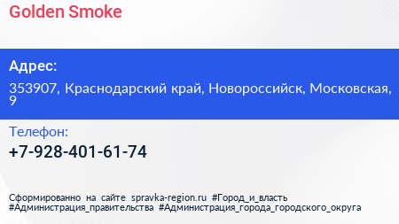 Golden Smoke по адресу 353907, Краснодарский край, Новороссийск, Московская, 9 в дальнейшем Организация, размещена в следующих категориях: