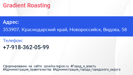Gradient Roаsting по адресу 353907, Краснодарский край, Новороссийск, Видова, 58 в дальнейшем Организация, размещена в следующих категориях: