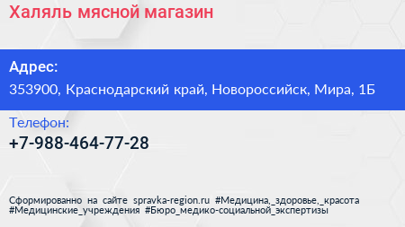 Халяль, мясной магазин по адресу 353900, Краснодарский край, Новороссийск, Мира, 1Б в дальнейшем Организация, размещена в следующих категориях:
