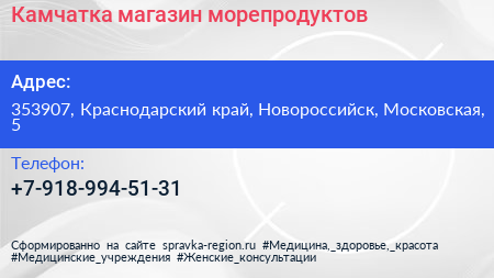 Камчатка, магазин морепродуктов по адресу 353907, Краснодарский край, Новороссийск, Московская, 5 в дальнейшем Организация, размещена в следующих категориях: