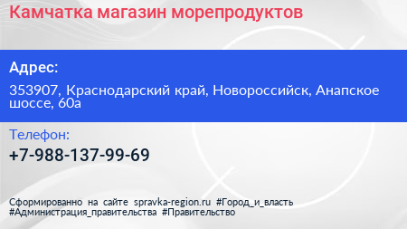 Камчатка, магазин морепродуктов по адресу 353907, Краснодарский край, Новороссийск, Анапское шоссе, 60а в дальнейшем Организация, размещена в следующих категориях: