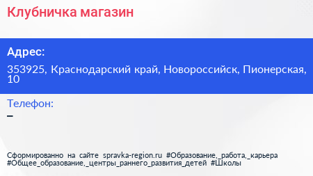Клубничка, магазин по адресу 353925, Краснодарский край, Новороссийск, Пионерская, 10 в дальнейшем Организация, размещена в следующих категориях: