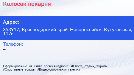 Колосок, пекарня по адресу 353917, Краснодарский край, Новороссийск, Кутузовская, 117в в дальнейшем Организация, размещена в следующих категориях: