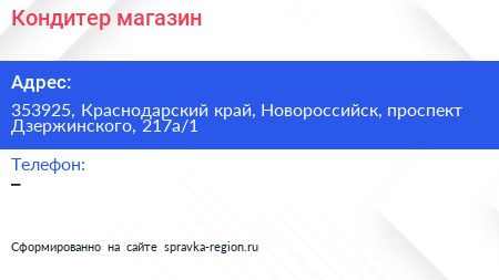 Кондитер, магазин по адресу 353925, Краснодарский край, Новороссийск, проспект Дзержинского, 217а/1 в дальнейшем Организация, размещена в следующих категориях: