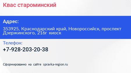 Квас староминский по адресу 353925, Краснодарский край, Новороссийск, проспект Дзержинского, 216г киоск в дальнейшем Организация, размещена в следующих категориях: