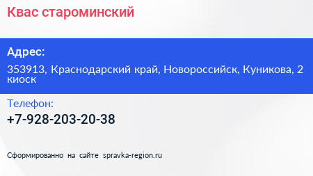 Квас староминский по адресу 353913, Краснодарский край, Новороссийск, Куникова, 2 киоск в дальнейшем Организация, размещена в следующих категориях: