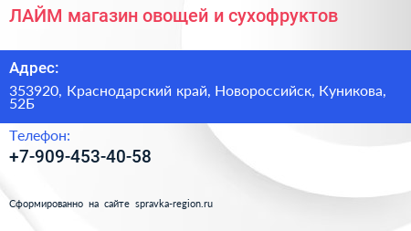 ЛАЙМ, магазин овощей и сухофруктов по адресу 353920, Краснодарский край, Новороссийск, Куникова, 52Б в дальнейшем Организация, размещена в следующих категориях: