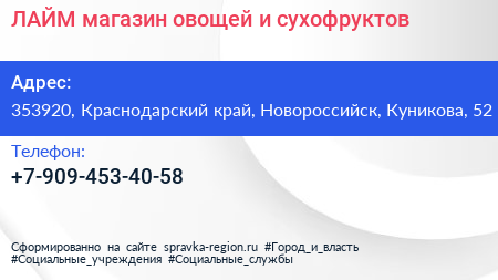 ЛАЙМ, магазин овощей и сухофруктов по адресу 353920, Краснодарский край, Новороссийск, Куникова, 52 в дальнейшем Организация, размещена в следующих категориях: