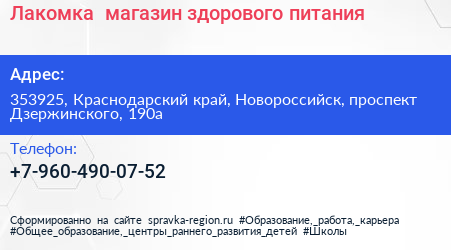Лакомка+, магазин здорового питания по адресу 353925, Краснодарский край, Новороссийск, проспект Дзержинского, 190а в дальнейшем Организация, размещена в следующих категориях:
