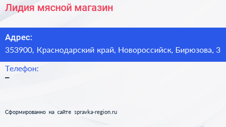 Лидия, мясной магазин по адресу 353900, Краснодарский край, Новороссийск, Бирюзова, 3 в дальнейшем Организация, размещена в следующих категориях:
