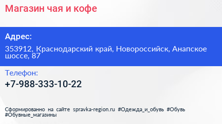 Магазин чая и кофе по адресу 353912, Краснодарский край, Новороссийск, Анапское шоссе, 87 в дальнейшем Организация, размещена в следующих категориях: