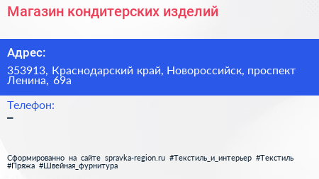 Магазин кондитерских изделий по адресу 353913, Краснодарский край, Новороссийск, проспект Ленина, 69а в дальнейшем Организация, размещена в следующих категориях: