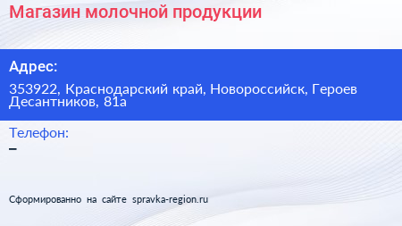 Магазин молочной продукции по адресу 353922, Краснодарский край, Новороссийск, Героев Десантников, 81а в дальнейшем Организация, размещена в следующих категориях: