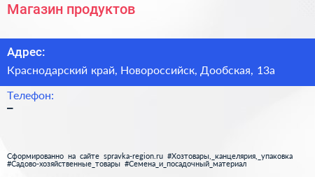 Магазин продуктов по адресу Краснодарский край, Новороссийск, Дообская, 13а в дальнейшем Организация, размещена в следующих категориях: