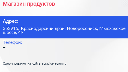 Магазин продуктов по адресу 353915, Краснодарский край, Новороссийск, Мысхакское шоссе, 49 в дальнейшем Организация, размещена в следующих категориях: