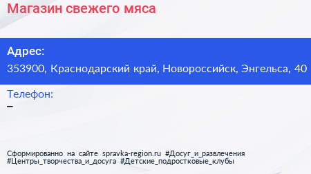 Магазин свежего мяса по адресу 353900, Краснодарский край, Новороссийск, Энгельса, 40 в дальнейшем Организация, размещена в следующих категориях: