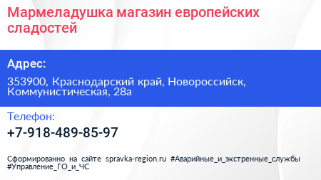 Мармеладушка, магазин европейских сладостей по адресу 353900, Краснодарский край, Новороссийск, Коммунистическая, 28а в дальнейшем Организация, размещена в следующих категориях: