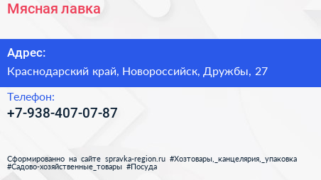Мясная лавка по адресу Краснодарский край, Новороссийск, Дружбы, 27 в дальнейшем Организация, размещена в следующих категориях: