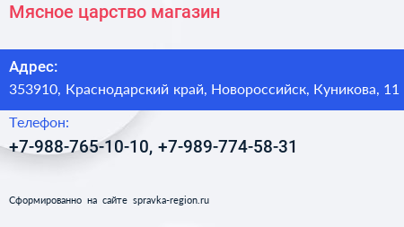 Мясное царство, магазин по адресу 353910, Краснодарский край, Новороссийск, Куникова, 11 в дальнейшем Организация, размещена в следующих категориях: