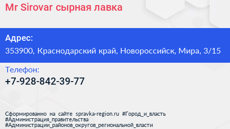 Mr.Sirovar, сырная лавка по адресу 353900, Краснодарский край, Новороссийск, Мира, 3/15 в дальнейшем Организация, размещена в следующих категориях:
