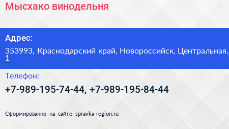 Мысхако, винодельня по адресу 353993, Краснодарский край, Новороссийск, Центральная, 1 в дальнейшем Организация, размещена в следующих категориях: